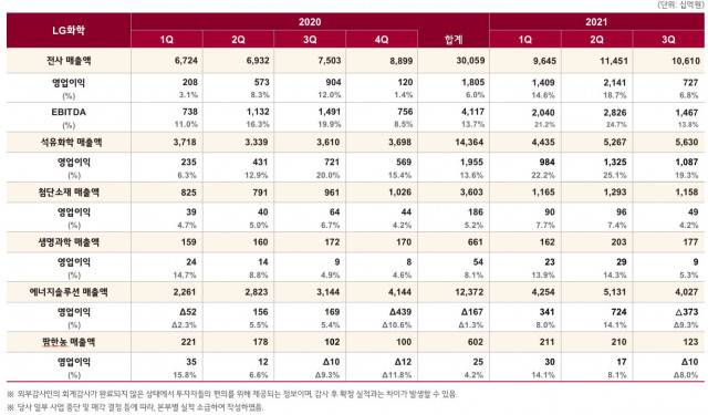 LG화학이 올해 3분기 △매출액 10조6102억원 △영업이익 7266억원의 경영 실적을 달성했다고 25일 발표했다.