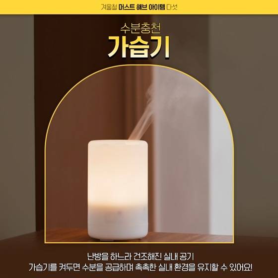 난방을 하느라 건조해진 실내 공기 가습기를 켜두면 수분을 공급하며 촉촉한 실내 환경을 유지할 수 있어요!
