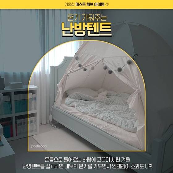 문틈으로 들어오는 바람에 코끝이 시린 겨울 난방텐트를 설치하면 내부의 온기를 가두면서 인테리어 효과도 UP!