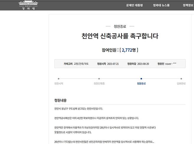 천안시 관계자는 "사업이 속히 정상 궤도로 올라갈 수 있도록 국토교통부 및 철도공단 등과의 협의에 박차를 가한다는 계획"이라며 "20년 넘게 임시역사로 운영되는 천안역 이용자 및 시민들의 편의를 위해 역사 건립이 조속하게 추진될 수 있도록 노력하겠다"고 말했다.