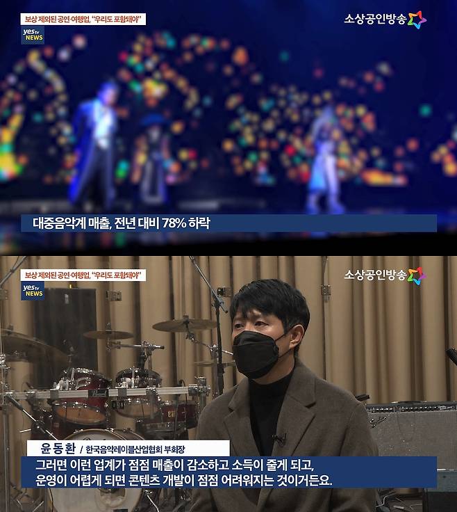 최근 소상공인방송 ‘Yestv NEWS’에서도 손실보상 지급 대상에서 제외된 대중음악업계를 취재한 뉴스를 방영해 관심을 모았다.