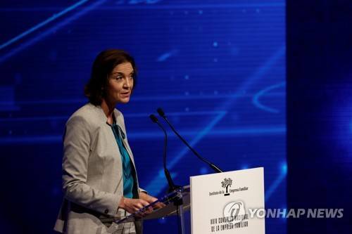 epa09544928 Spanish Industry, Trade and Tourism Minister, Reyes Maroto, delivers a speech during the 24th Spanish National Family-run Companies Congress in Pamplona, northern Spain, 25 October 2021. The congress is held amid the context of economic recovery and the impact of the rising electricity price and raw materials. EPA/Jesus Diges