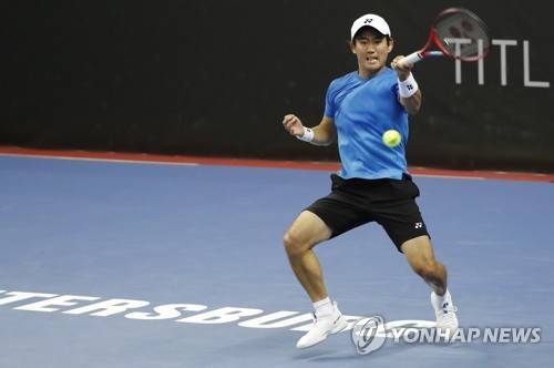 epa09544941 Yoshihito Nishioka of Japan in action against Miomir Kecmanovic of Serbia during their match of the St.Petersburg Open ATP tennis tournament in St.Petersburg, Russia, 25 October 2021. EPA/ANATOLY MALTSEV