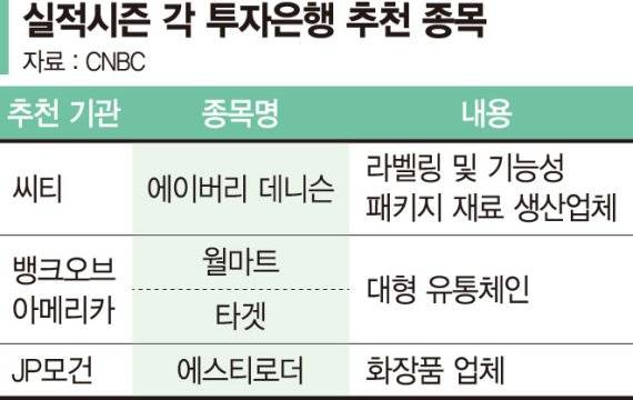 미국 월가 애널리스트들이 추천하는 어닝시즌 최선호 종목에 에이버리데니슨, 월마트, 타겟, 에스티로더, AMD 등이 포함됐다. 동종 업종의 경쟁사들보다 가격결정력과 매출 등에서 월등히 앞설 것이라는 이유에서다.