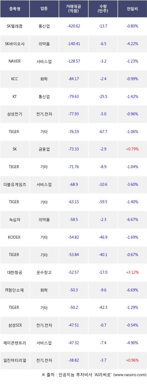 25일, 기관 거래소에서 SK텔레콤(-0.8%), SK바이오사이언스(-4.22%) 등 순매도