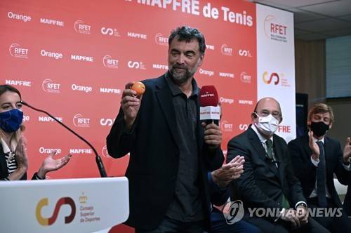 epa09545011 Captain of the Spanish Team, Sergi Bruguera (C) during the presentation of the Spanish tennis team that will be competing in the Davis Cup Finals in Madrid, Spain, 25 October 2021. The Davis Cup finals will be taking place in Madrid from 25 November to 05 December 2021. EPA/FERNANDO VILLAR