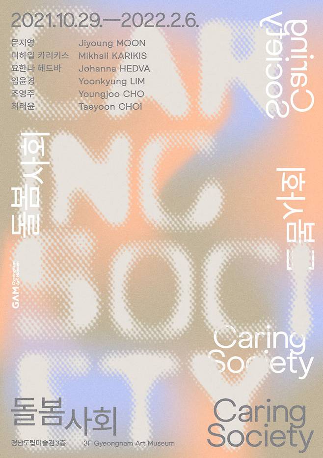 경남도립미술관은 오는 29일부터 내년 2월 6일까지 동시대미술기획전 ‘돌봄사회’(포스터)를 개최한다. ‘돌봄’을 소재로 한 국내외 작가 6명의 회화, 영상, 설치 등 작품 약 40점을 선보인다. 문지영, 임윤경, 최태윤, 조영주와 미국 로스앤젤레스와 독일 베를린에서 활동하는 한국계 미국인 예술가 요한나 헤드바, 포르투갈 리스본과 영국 런던에서 활동하는 그리스계 영국인 예술가 미하일 카리키스가 참여한다.