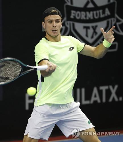 epa09545105 Dmitry Popko of Kazakhstan in action during the qualifying match against Emil Ruusuvuori of Finland at the St.Petersburg Open ATP tennis tournament in St.Petersburg, Russia, 25 October 2021. EPA/ANATOLY MALTSEV