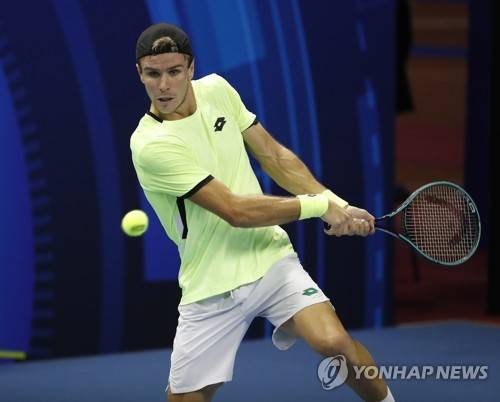epa09545108 Dmitry Popko of Kazakhstan in action during the qualifying match against Emil Ruusuvuori of Finland at the St.Petersburg Open ATP tennis tournament in St.Petersburg, Russia, 25 October 2021. EPA/ANATOLY MALTSEV