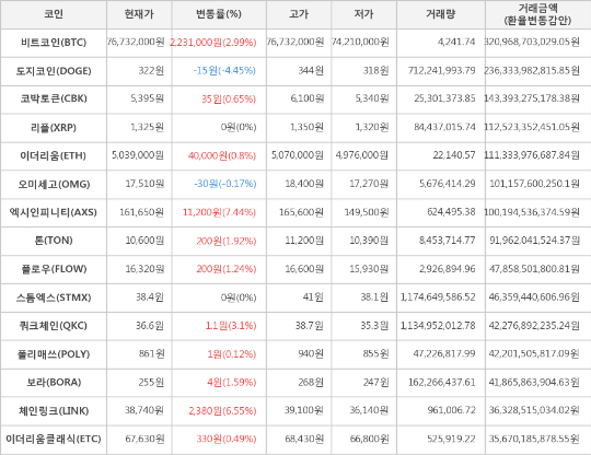 가상화폐 비트코인 2.99% 상승, 엑시인피니티 7.44% 상승