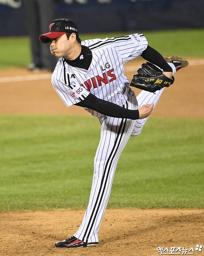 (엑스포츠뉴스 잠실, 박지영 기자) 25일 오후 서울 송파구 잠실야구장에서 열린 '2021 신한은행 SOL KBO리그' 롯데 자이언츠와 LG 트윈스의 경기, 7회초 무사 1루 LG 백승현이 역투하고 있다.