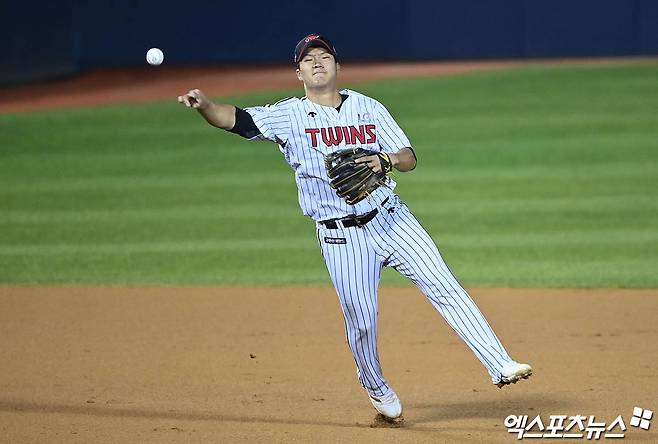 (엑스포츠뉴스 잠실, 박지영 기자) 25일 오후 서울 송파구 잠실야구장에서 열린 '2021 신한은행 SOL KBO리그' 롯데 자이언츠와 LG 트윈스의 경기, 7회초 무사 1루 LG 3루수 문보경이 롯데 마차도의 땅볼 타구를 잡아 1루로 송구하고 있다.