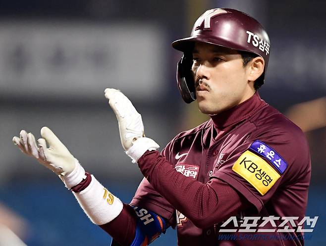 25일 대전 한화생명이글스파크, KBO리그 키움과 한화 경기. 6회초 1사 2, 3루 이용규가 1타점 적시타를 치고 나가 기뻐하고 있다. 대전=정재근 기자 cjg@sportschosun.com/2021.10.25/