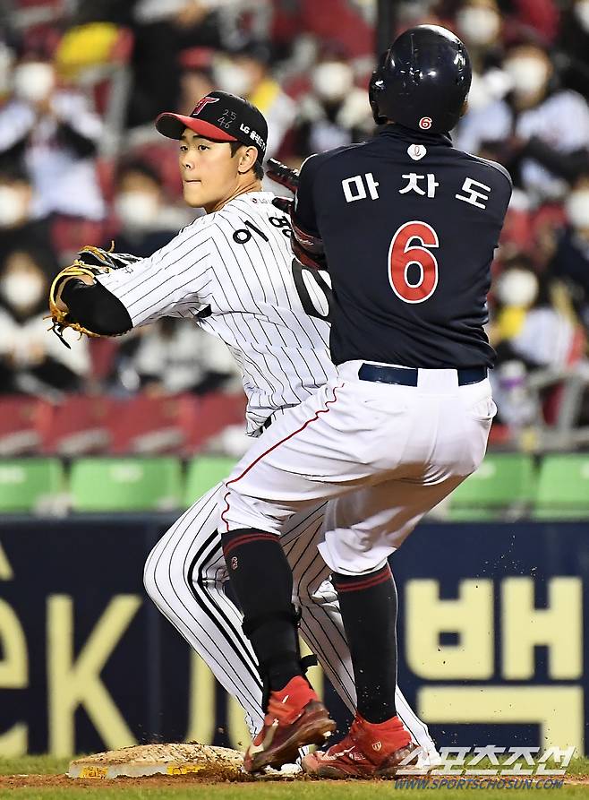 2021 KBO리그 LG 트윈스와 롯데 자이언츠의 경기가 25일 잠실구장에서 열렸다. 7회초 무사 1루 롯데 마차도가 내야 땅볼 때 LG 1루수 이영빈과 충돌하고 있다. 잠실=박재만 기자 pjm@sportschosun.com/2021.10.25/