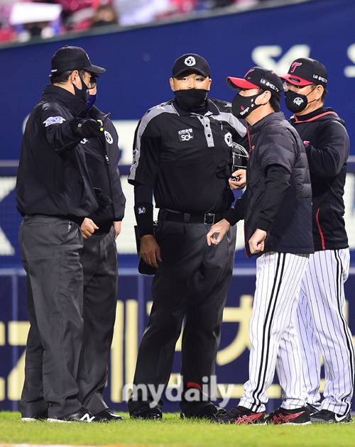 [마이데일리 = 곽경훈 기자] LG 류지현 감독이 25일 오후 서울 잠실야구장에서 진행된 '2021 신한은행 SOL KBO리그' 롯데-LG의 경기 7회초 무사 1루에서 마차도의 수비 방해라고 심판에게 어필하고 있다.- ⓒ마이데일리(www.mydaily.co.kr). 무단전재&재배포 금지 -