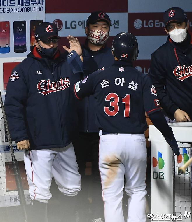 (엑스포츠뉴스 잠실, 박지영 기자) 25일 오후 서울 송파구 잠실야구장에서 열린 '2021 신한은행 SOL KBO리그' 롯데 자이언츠와 LG 트윈스의 경기, 8회초 1사 1루 롯데 한동희의 1타점 적시 2루타 때 1루주자 손아섭이 득점을 올린 뒤 더그아웃에서 서튼 감독과 하이파이브를 나누고 있다.