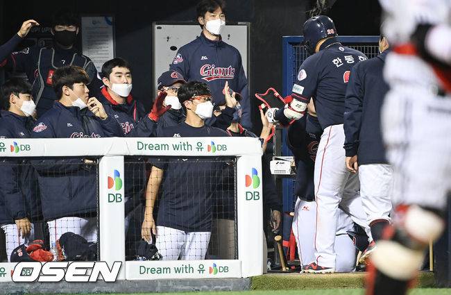 8회초 롯데 박세웅이 동점타 날린뒤 교체되는 한동희를 맞이하고 있다. 2021.10.25 / soul1014@osen.co.kr