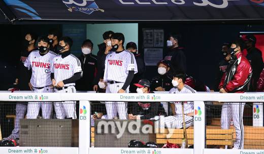 [마이데일리 = 곽경훈 기자] LG 선수들이 25일 오후 서울 잠실야구장에서 진행된 '2021 신한은행 SOL KBO리그' 롯데-LG의 경기 7회초 1사 3루 신용수의 파울 타구를 놓친 1루수 이영빈을 바라보고 있다.- ⓒ마이데일리(www.mydaily.co.kr). 무단전재&재배포 금지 -