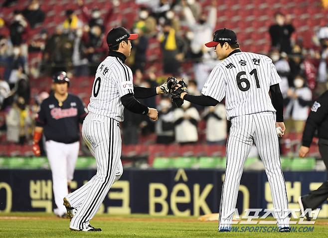 2021 KBO리그 LG 트윈스와 롯데 자이언츠의 경기가 25일 잠실구장에서 열렸다. 7회초 2사 3루 롯데 이대호의 내야 깊은 타구를 처리한 LG 유격수 오지환이 백승현과 하이파이브를 나누고 있다. 잠실=박재만 기자 pjm@sportschosun.com/2021.10.25/