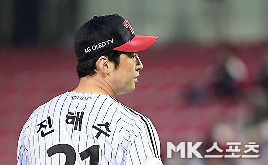 8회초 1사 1루에서 LG 진해수가 롯데 한동희에게 동점타를 맞고 아쉬워 하고 있다.