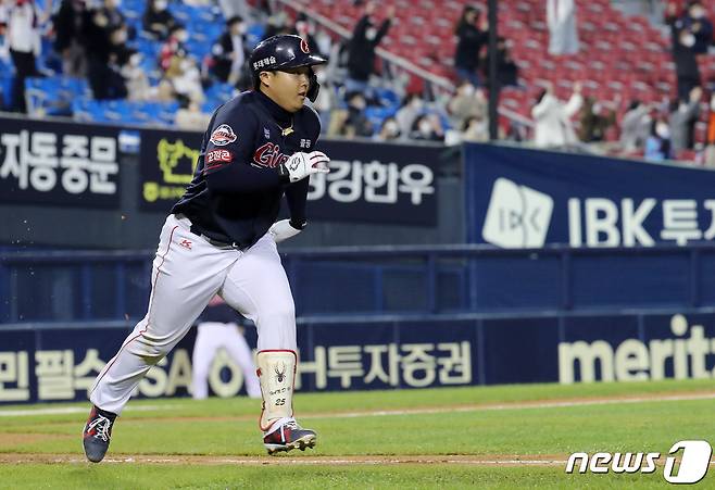 (서울=뉴스1) 박세연 기자 = 25일 오후 서울 잠실야구장에서 열린 '프로야구 2021 신한은행 SOL KBO리그' LG와 롯데의 경기에서 롯데 한동희가 8회초 1사 2루상황에서 1타점 2루타를 치고 2루베이스로 향하고 있다. 2021.10.25/뉴스1