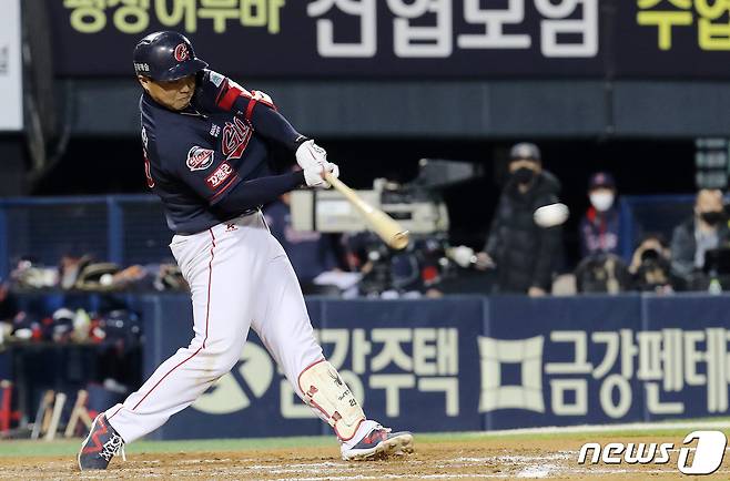 (서울=뉴스1) 박세연 기자 = 25일 오후 서울 잠실야구장에서 열린 '프로야구 2021 신한은행 SOL KBO리그' LG와 롯데의 경기에서 롯데 한동희가 8회초 1사 2루상황에서 1타점 2루타를 치고 있다. 2021.10.25/뉴스1