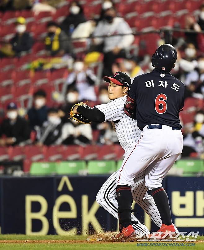 2021 KBO리그 LG 트윈스와 롯데 자이언츠의 경기가 25일 잠실구장에서 열렸다. 7회초 무사 1루 롯데 마차도가 내야 땅볼 때 LG 1루수 이영빈과 충돌하고 있다. 잠실=박재만 기자 pjm@sportschosun.com/2021.10.25/