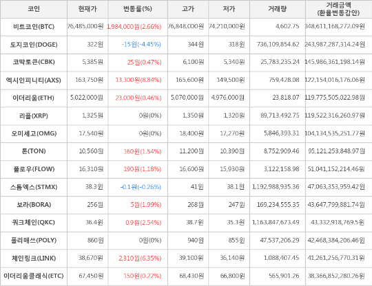 현재 암호화폐 거래소 "업비트"에 따르면 가상화폐 대장 격인 비트코인의 시세는 전일 대비 1,984,000원(2.66%) 상승한 76,485,000원에 거래되고 있다.