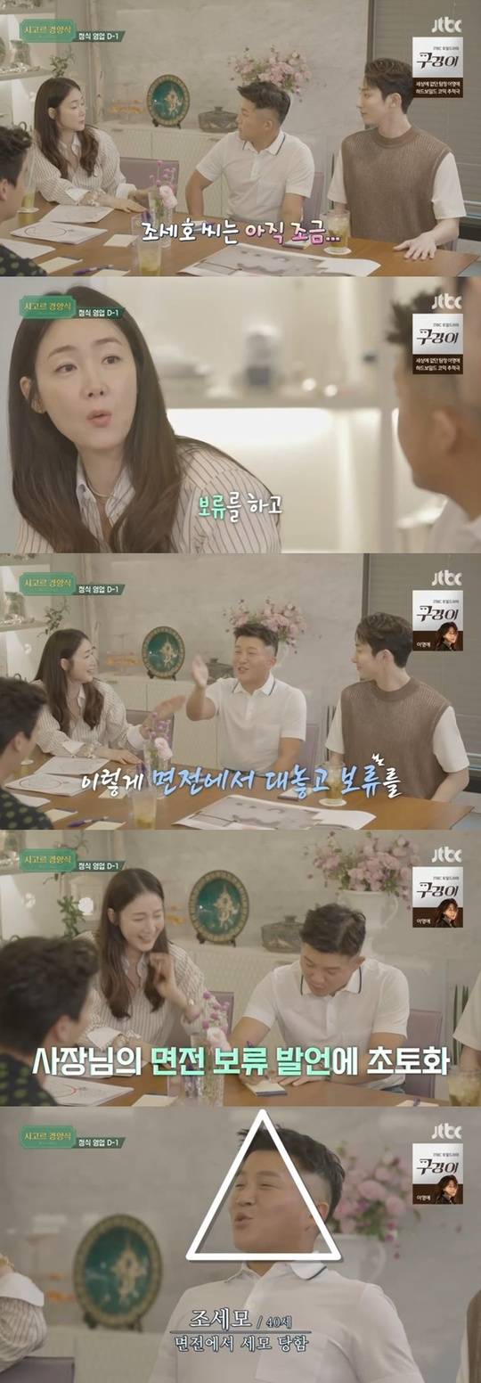 차인표는 최지우에게 “주방과 홀 팀을 나눠야 한다. 누구랑 일하고 싶냐”고 질문했고 최지우는 “(차인표는) 셰프님이시고 (이장우는) 요리에 관심이 많고, 조세호는 아직 보류하고”라고 답해 웃음을 자아냈다. 조세호는 “이렇게 면전에서 보류를? 보통 없을 때 보류하는 거 아니냐”고 당황했다.