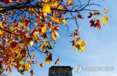 epa09545285 View shows autumn colour trees next to Reichstag building, the seat of the German parliament in Berlin, Germany, 25 October 2021. EPA/FILIP SINGER