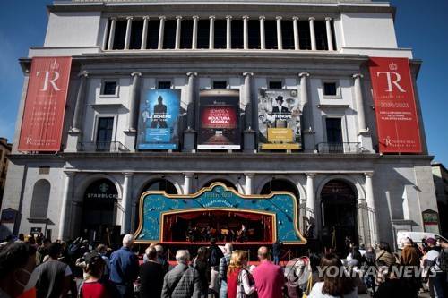 epa09545301 Several passers-by look at a show held outside Teatro Real opera house to mark the World Opera Day in Madrid, Spain, 25 October 2021. EPA/LUCA PIERGIOVANNI
