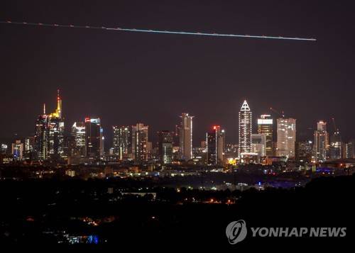 This Oct. 3, 2021 taken long exposure photo shows an aircraft flying over the buildings of the banking district in Frankfurt, Germany. A closely watched survey of German business optimism has sagged for the fourth month in a row. The lower reading Monday for the Ifo Institute's index is underlining concern about the impact on Europe’s largest economy from sharply higher energy prices and troubles getting raw materials and parts. (AP Photo/Michael Probst)