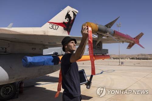 An Israeli F-16 technician checks an air-to-air missile during the bi-annual multi-national aerial exercise known as the Blue Flag, at Ovda airbase near Eilat, southern Israel, Sunday, Oct. 24, 2021. Israel's military is holding the largest ever air drill of its kind with participation from eight countries including the U.S., Britain, Germany, Italy, Greece, India and France in the two week-long drill. (AP Photo/Tsafrir Abayov)