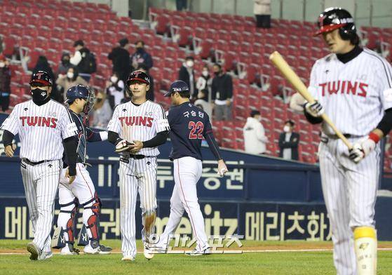 2021프로야구 KBO리그 LG트윈스와 롯데자이언츠의 경기가 25일 오후 서울 잠실야구장에서 열렸다. 9회말 2사 3루 이형종이 삼진을 당하며 4대 4 무승부로 경기를 마친 양팀 선수들이 더그아웃으로 들어가고 있다.