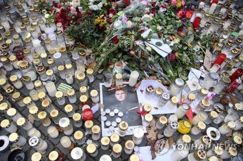 epa09545328 Flowers and candles are laid at a makeshift memorial near the spot where the best selling Swedish rap artist Einar was shot dead, in the Hammarby Sjostad district of Stockholm, Sweden, 25 October 2021. Einar was shot to death in the street late 21 October 2021, according to police. EPA/JESSICA GOW SWEDEN OUT