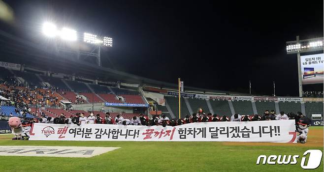 (서울=뉴스1) 박세연 기자 = 25일 오후 서울 잠실야구장에서 열린 '프로야구 2021 신한은행 SOL KBO리그' LG와 롯데의 경기에서 4대4로 시즌 마지막 홈경기를 마친 LG선수들이 팬들에게 인사를 하고 있다. 2021.10.25/뉴스1