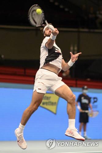 epa09545335 Nikoloz Basilashvili of Georgia in action during his first round match against Pablo Carreno Busta of Spain of the Erste Bank Open ATP tennis tournament in Vienna, Austria, 25 October 2021. EPA/CHRISTIAN BRUNA