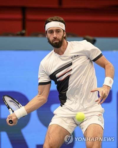 epa09545348 Nikoloz Basilashvili of Georgia in action during his first round match against Pablo Carreno Busta of Spain of the Erste Bank Open ATP tennis tournament in Vienna, Austria, 25 October 2021. EPA/CHRISTIAN BRUNA
