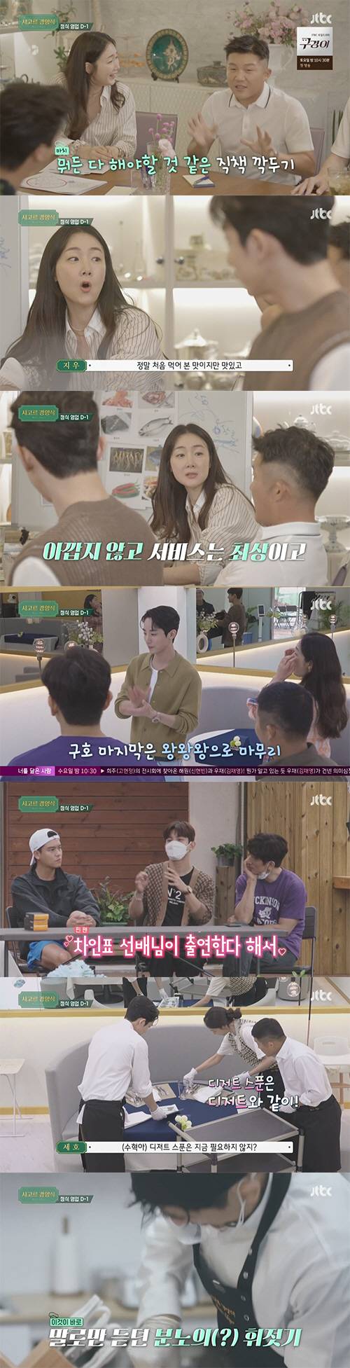결국 주방팀은 "셰프님들에게 봐달라고 해야 할 것 같다"라고 최지우 사장님에게 이야기했고, 식사를 하던 스승님들은 주방으로 향했다. 조세호는 "그럼 이때 홀 매니저님에게 질문을 해야겠다"라며 부족했던 것에 대해 직접 물어보며 배우는 모습을 보였다.