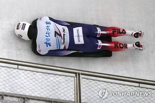 Kim Ji-soo of South Korea competes during the men's skeleton in an IBSF Sanctioned Race, a test event for the 2022 Winter Olympics, at the Yanqing National Sliding Center in Beijing, Monday, Oct. 25, 2021. (AP Photo/Mark Schiefelbein)
