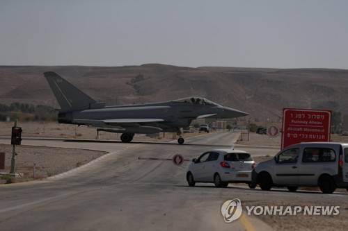 epa09545372 A British Eurofighter aircraft landing at the Israeli airbase of Ovda in the Negev Desert near the southern Israeli city of Eilat, Israel, during the "Blue Flag" exercise on 24 October 2021. The fifth "Blue Flag" exercise is a large-scale international aerial exercise, which takes place once every two years. The purpose of the exercise is to simulate challenging combat scenarios and coalition flight, in the most realistic way. The current exercise is the largest and most advanced exercise to date, in which eight countries participate in the practice of combining 4th generation aircraft with 5th generation (35-F) aircraft, which expands the capabilities of the Israeli Air Force on the battlefield, with air cooperation including dealings. EPA/ATEF SAFADI