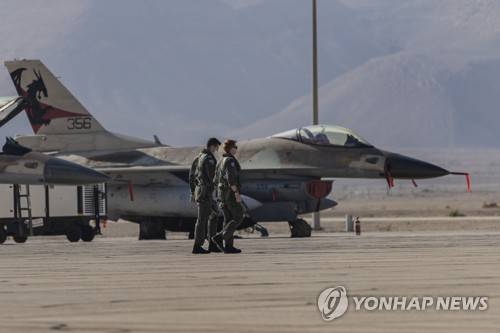 Israeli air force pilots walk near a F-16 during the bi-annual multi-national aerial exercise known as the Blue Flag, at Ovda airbase near Eilat, southern Israel, Sunday, Oct. 24, 2021. Israel's military is holding the largest ever air drill of its kind with participation from eight countries including the U.S., Britain, Germany, Italy, Greece, India and France in the two week-long drill. (AP Photo/Tsafrir Abayov)