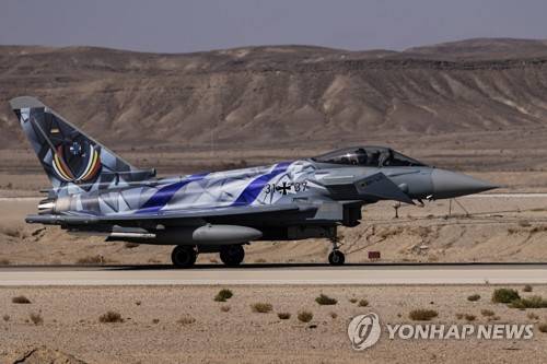 A German air force Eurofighter Typhoon painted with the colors of the Israeli flag lands during the bi-annual multi-national aerial exercise known as the Blue Flag, at Ovda airbase near Eilat, southern Israel, Sunday, Oct. 24, 2021. Israel's military is holding the largest ever air drill of its kind with participation from eight countries including the U.S., Britain, Germany, Italy, Greece, India and France in the two week-long drill. (AP Photo/Tsafrir Abayov)