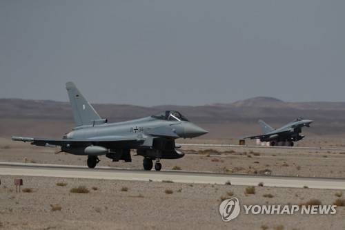 epa09545395 A German Eurofighter aircraft landing at the Israeli airbase of Ovda in the Negev Desert near the southern Israeli city of Eilat, Israel, during the "Blue Flag" exercise on 24 October 2021. The fifth "Blue Flag" exercise is a large-scale international aerial exercise, which takes place once every two years. The purpose of the exercise is to simulate challenging combat scenarios and coalition flight, in the most realistic way. The current exercise is the largest and most advanced exercise to date, in which eight countries participate in the practice of combining 4th generation aircraft with 5th generation (35-F) aircraft, which expands the capabilities of the Israeli Air Force on the battlefield, with air cooperation including dealings. EPA/ATEF SAFADI