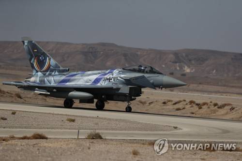 epa09545409 A German Typhoon Eurofighter aircraft landing at the Israeli airbase of Ovda in the Negev Desert near the southern Israeli city of Eilat, Israel, during the "Blue Flag" exercise on 24 October 2021. The fifth "Blue Flag" exercise is a large-scale international aerial exercise, which takes place once every two years. The purpose of the exercise is to simulate challenging combat scenarios and coalition flight, in the most realistic way. The current exercise is the largest and most advanced exercise to date, in which eight countries participate in the practice of combining 4th generation aircraft with 5th generation (35-F) aircraft, which expands the capabilities of the Israeli Air Force on the battlefield, with air cooperation including dealings. EPA/ATEF SAFADI