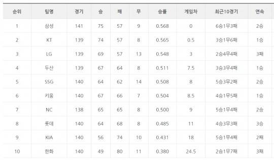 [프로야구 25일 팀 순위]LG, 7경기째 무승(4무3패)으로 70승 문턱 못 넘고 선두 싸움 동력 잃어..키움은 한화 눌러 단독 6위로 가을야구 희망 이어가