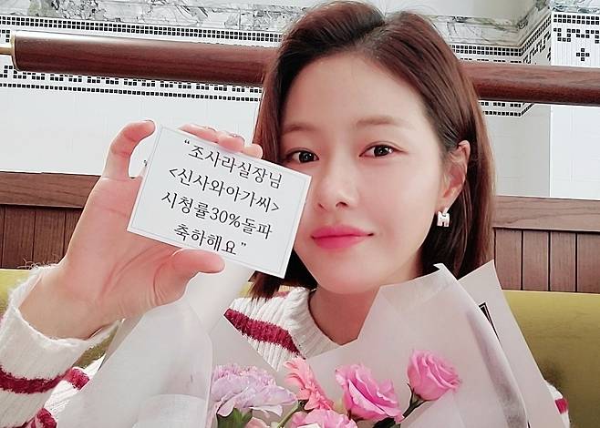 사진 속 박하나는 화사한 꽃다발을 안고 예쁜 미소를 지었다. 그는 '조사라 실장님 '신사와 아가씨' 시청률 30% 돌파 축하해요'라는 메시지를 들고 자랑했다.