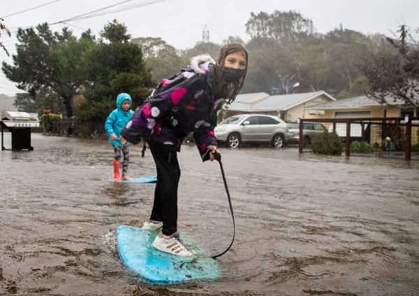 어린이들이 24일(현지시간) 미국 캘리포니아 밀밸리의 한 침수된 도로에서 서핑보드를 타고 놀고 있다. 지난여름 역대 최악의 산불에 시달렸던 캘리포니아주에선 최근 일부 지역에서 폭우가 쏟아져 주민들이 수재민이 될 처지로 내몰렸다. AP연합뉴스
