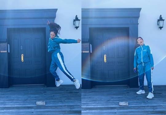 사진 속엔 넷플릭스 오리지널 시리즈 '오징어 게임' 속 주인공 성기훈(이정재 분)이 착용한 트레이닝복을 입고 딱지치기 중인 진재영 모습이 담겨있다.