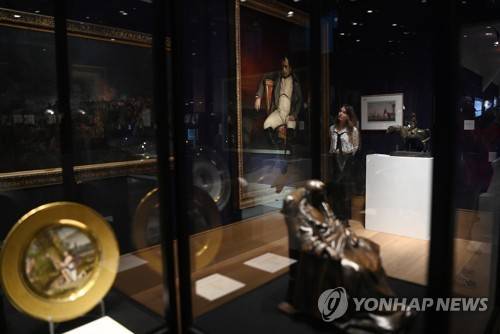 epa09545467 An auction house employee poses for photographer next to a painting by Paul Hippolyte Delaroche "Napoleon Abdiquant a Fontainebleau" in London, Britain 25 October 2021. The sale will take place on 27 October. EPA/FACUNDO ARRIZABALAGA